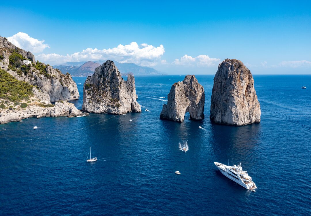 Naviga verso Capri e lasciati incantare dai suoi faraglioni e dalle acque cristalline.